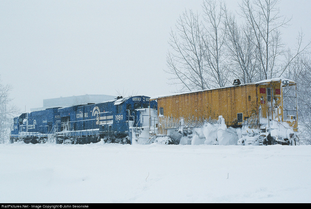 Just like Donner-almost. It's a Saturday morning in early December as a Nor'easter winds down from dumping 2 feet of snow on the Berkshires. In 1992 the Boston Line was running heavy with most New England East-West traffic. To keep the line fluid, Conrail ran this flanger train back and forth over Washington Hill throughout the night. Power is CR GP15-1 #1646 and CR B23-7 #1989. The flanger was built by Conrail at Hollidaysburg in 1978.