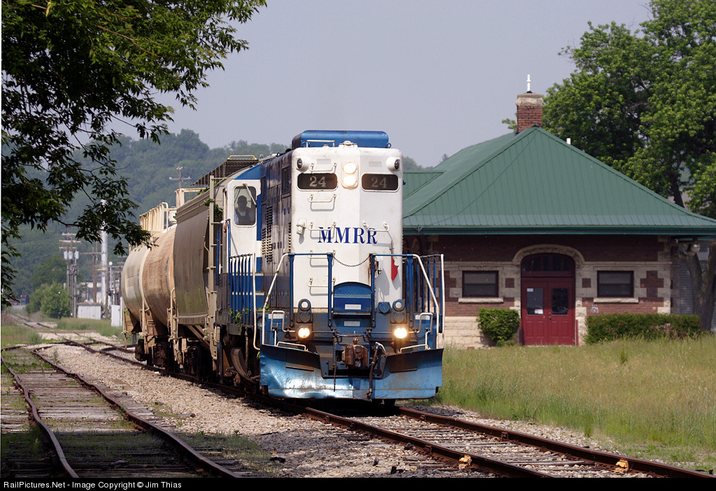 | #24 is near the east end of MMRR's west Michigan line to deliver two tank cars to their lone customer in Ionia, MI. It's only a matter of time before this scene of a train in front of Ionia's depot no longer takes place, as plans for elimination of the Lowell-to-Ionia line are already in the works. |