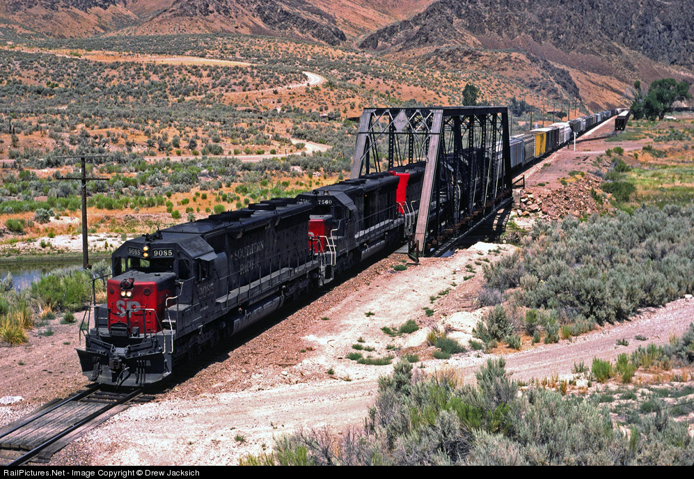 | SP 9085 Westbound thru Palisade, Nevada where the SP once connected with the Eureka and Palisade. The SP depot was in the grove of trees to the right of track and the E&P facilites were further off to the right. The former WP r-o-w is along the South side of the river out of view |