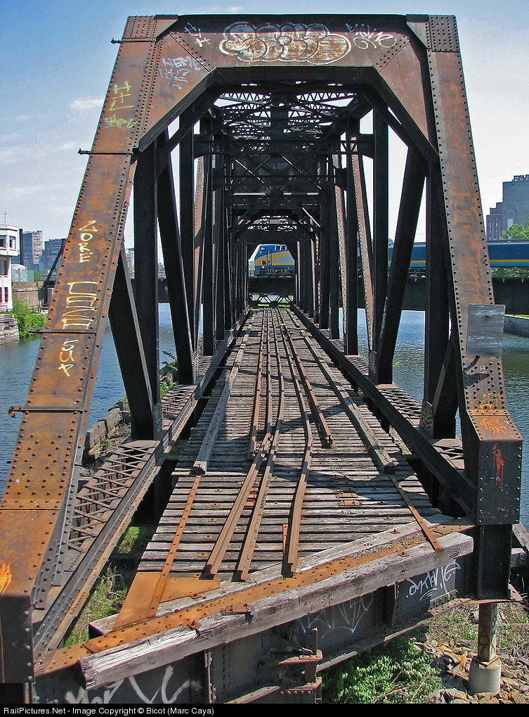 | Built at the turn of the century, the Wellington turning bridge is sitting dead with its access tracks on each side ripped off. Behind it, Via 907 is passing by on the locked down and crippled lift bridge. |