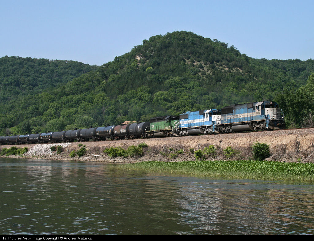 | The first BNSF ethanol train rolls down river at Victory with a nice EMD lashup, although the second oakway would have been nicer |