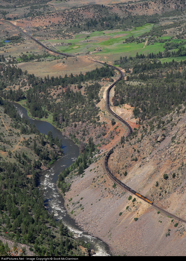 | Hiking high up in Gore Canyon on a sunny and hot morning with a friend of mine, I got this shot of an EB coal train passing by Azure siding and entering the canyon. |