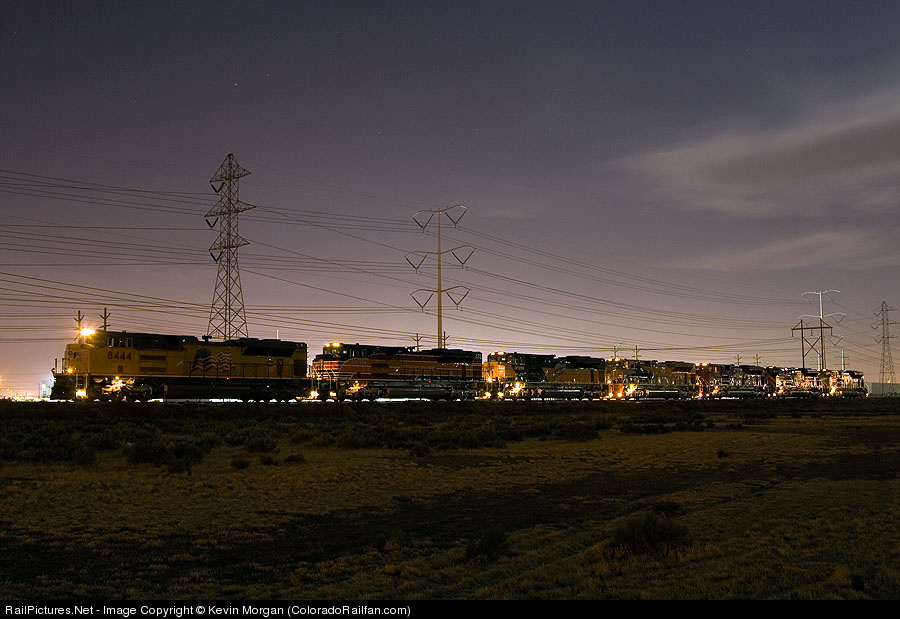 | In the wee hours of the night (around 1:30am), the six Heritage Units along with UP 8444 line up in Salt Lake City in preparation of the next days events. |
