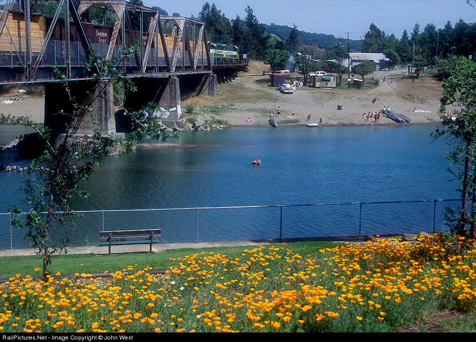 The Cal Northern (former Northwestern Pacific) crosses the Russian River southbound at Healdsburg on a warm spring afternoon with the California poppies in full bloom.