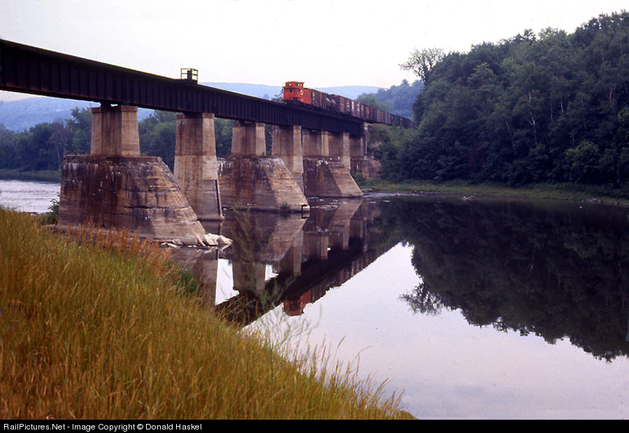 | The rear end is also dramatic. Bright orange wooden CV caboose is reflected in the smooth as glass White River. Bridge is just one of many high black steel trusses on the CV and whole CNR for that matter. Just a way for trains to cross the river when you |