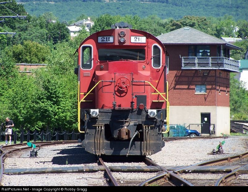 | Delaware Lackawanna RS32 211 sits at Steamtown Yard leading two more Alcos, one in Indiana Hi-Rail paint and the other in DL's Genesee Valley paint. I wonder how many people mistake these Alcos to be owned by Steamtown. :) |