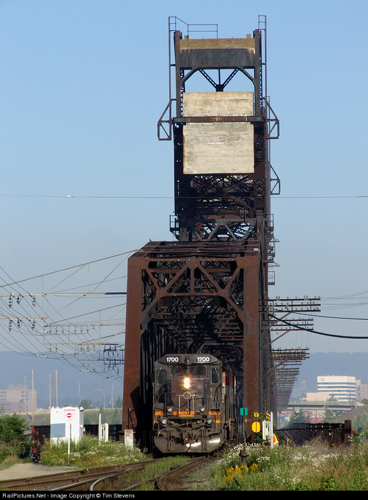 | BCOL 1700, painted for the defunct Whistler Northwind passenger train, pulls off of the bridge heading down to the old BC Rail Yard in Prince George for it's train. |