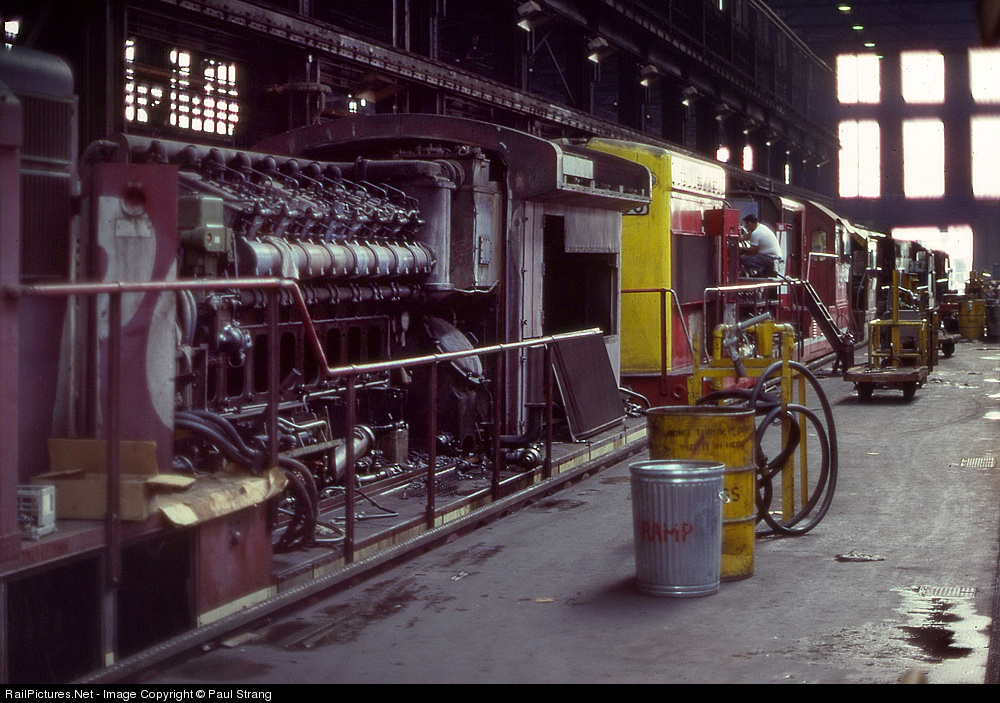 With the RI nearing the end and having touble keeping power on the road, a lone mechanic works on a U28B in a line of GEs and EMDs inside Rock Island's main repair facility.