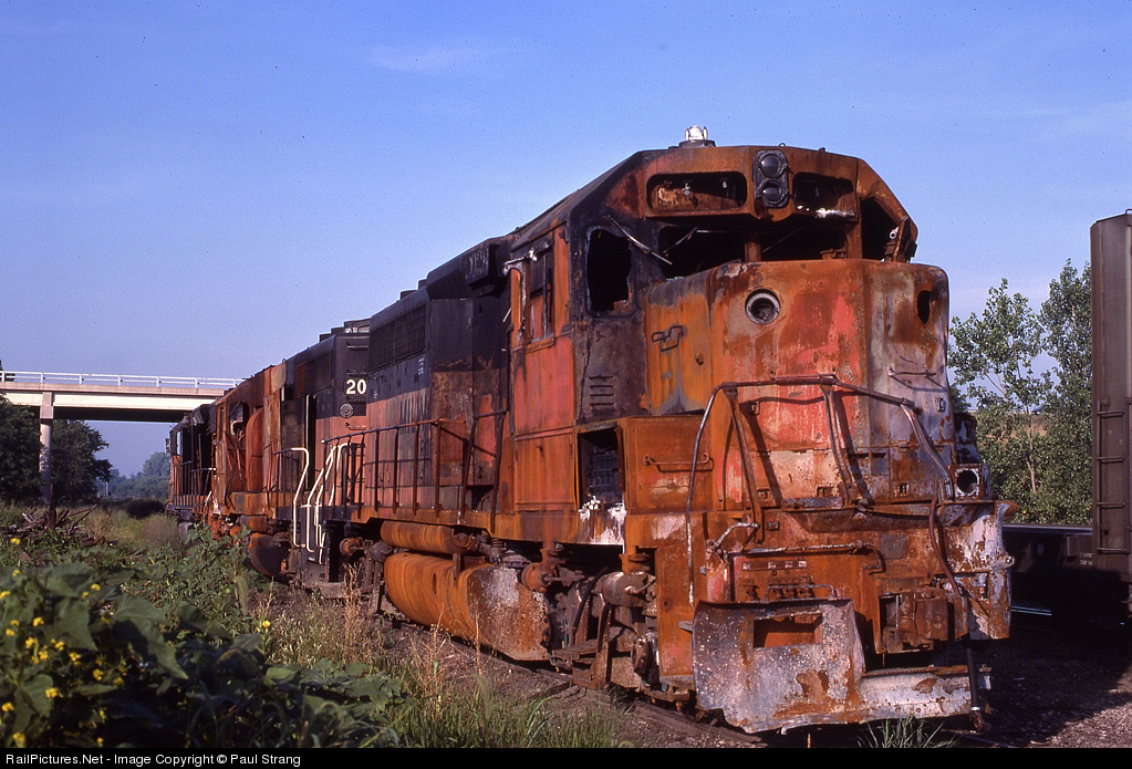 Three wrecked and burned GP40s sit on the siding at Nahant, just west of the yard. 2028-2053-2069.