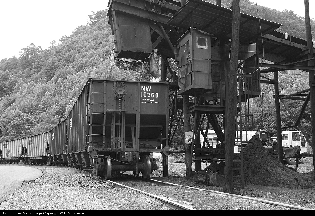 | Mtys just set at the Black Wolf Mining loadout on the Sand Lick Branch of the Tug Branch of the Pocahontas. With the steep grade, sand has just been poured on the rails before loading by gravity as the mtys roll downhill. |