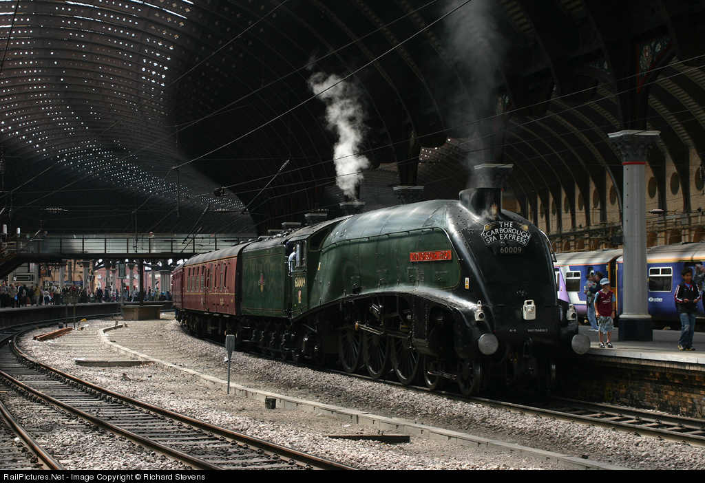 | Despite electrification, the magnificent curved trainshed of York station is still a great place to watch an A4 Pacific. "No.9" prepares to leave with the first of this year's Scarborough Spa Express excursions, which run every Tuesday, Wednesday and Thursday until August 30. |