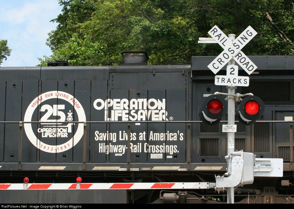 A NS Operation Lifesaver Dash 9 rolls through a rural crossing near Toyota.