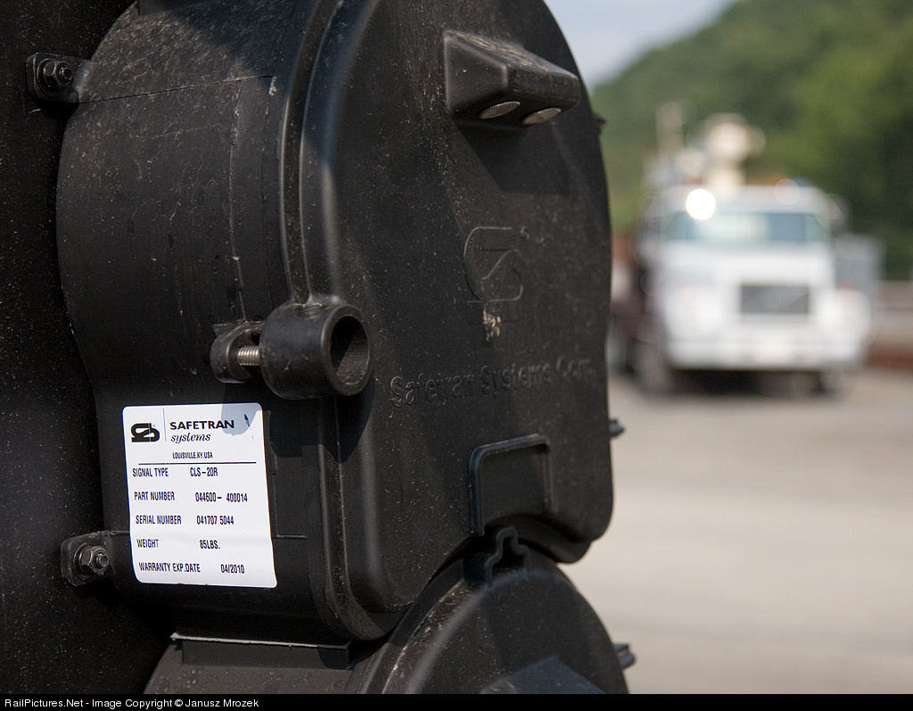 | A brand new Safetran signal awaits installation in Hancock, perhaps with the assistance of the maintenance truck in the background. |