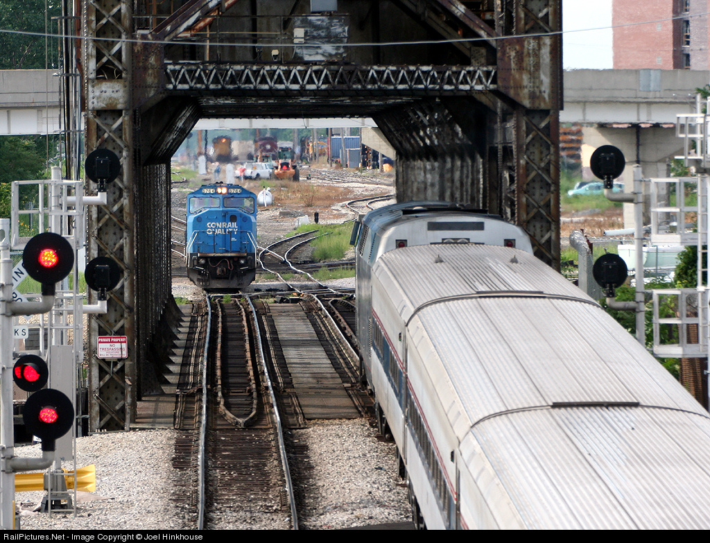 | Conrail-painted NS 6764 is shuttling, while Amtrak 303 to St. Louis hits the Chicago River South Branch bridge. The interlocking is with the Illinois Central/Canadian National. In the distance can be seen locomotives (including Katy "Heritage" UP 1988) awaiting trains departing from UP's Canal Street Yard. |