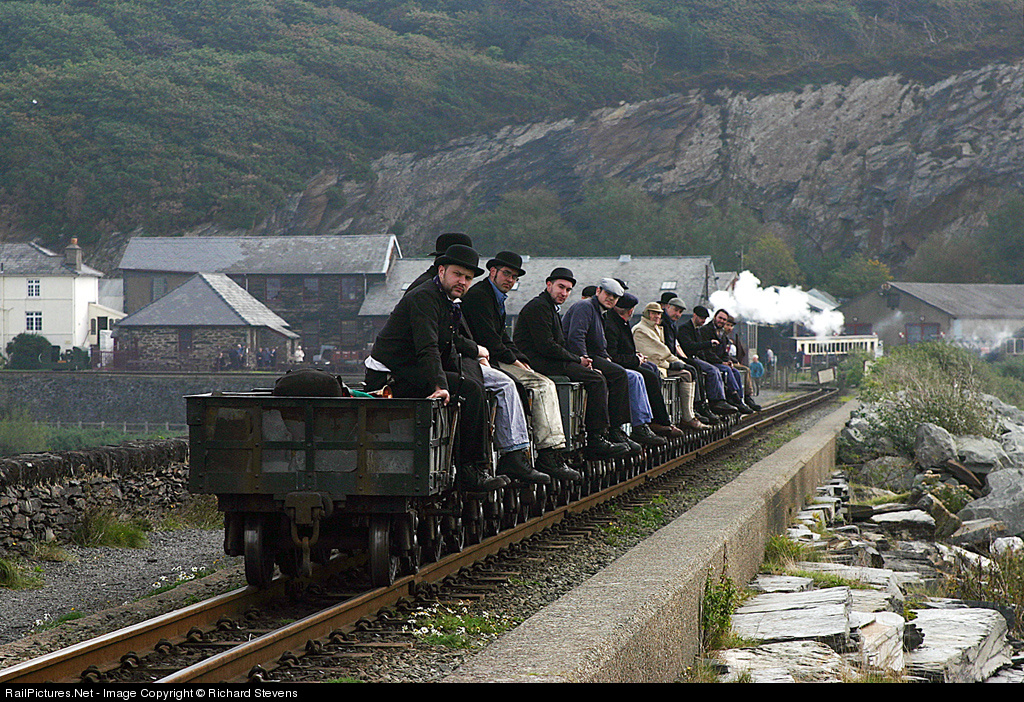 The Ffestinog Railway was built in the 1830s as a horse and gravity operated line to transport slate from the quarries at Blaenau Ffestiniog to the harbour at Porthmadog. This is a recreation of a gravity slate train, gradually losing momentum as it hits the level track of The Cob at Porthmadog, with a full complement of brakemen in Victorian costume!