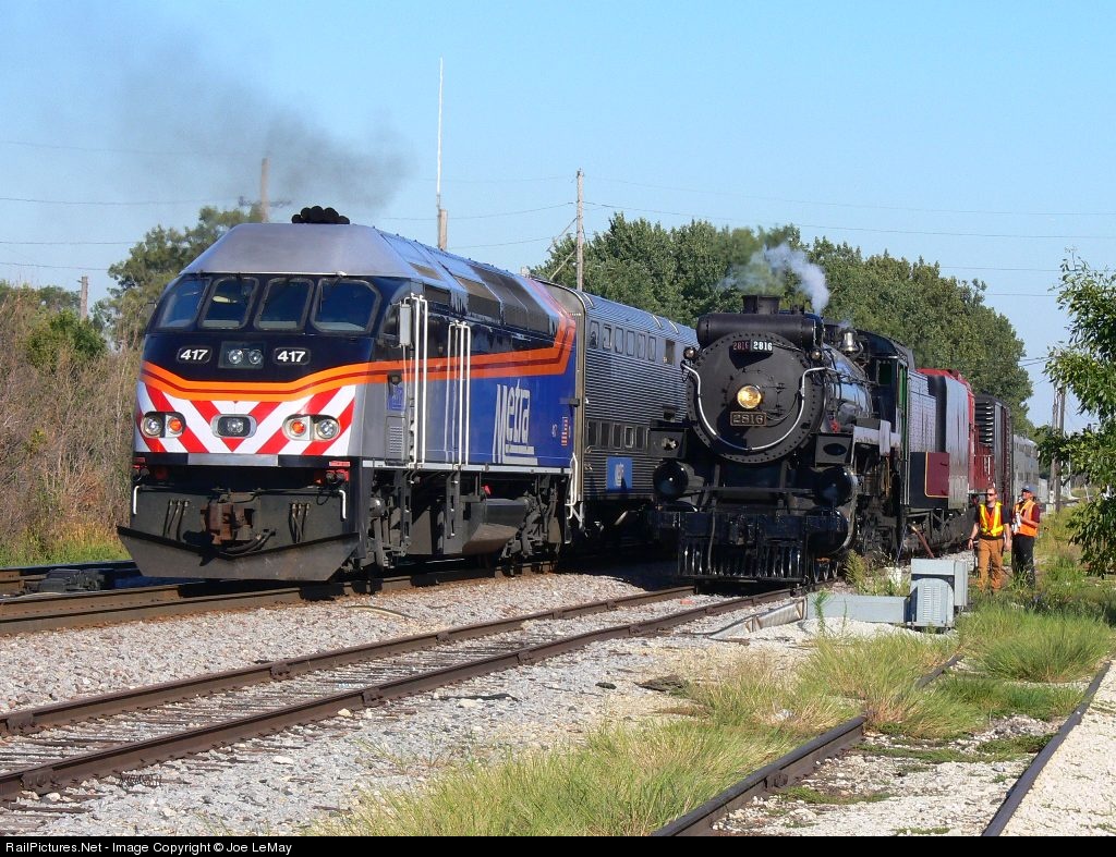 | One is 77 years old, one is 4 years old - they both pushed and pulled passenger trains today! The 2816 was being filled with water from a fire hydrant when this inbound Metra passed by. |