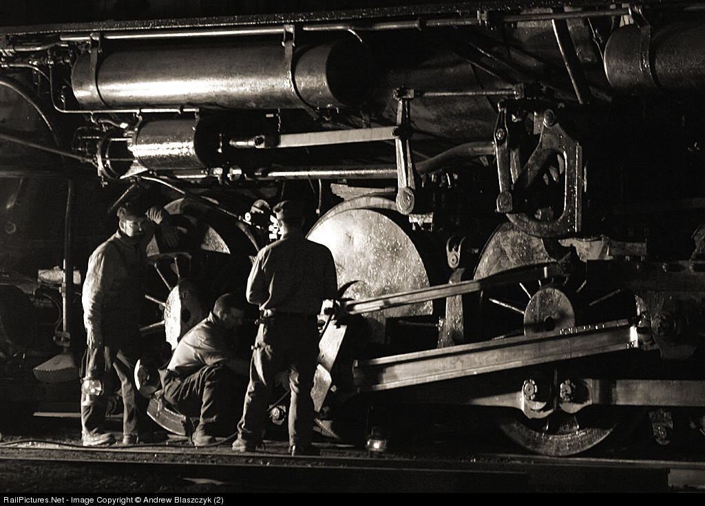 | The lights from the enginehouse glisten off the rods and drivers of the magnificent 'Berk' as the crew goes about their normal procedures before the next day's run. |
