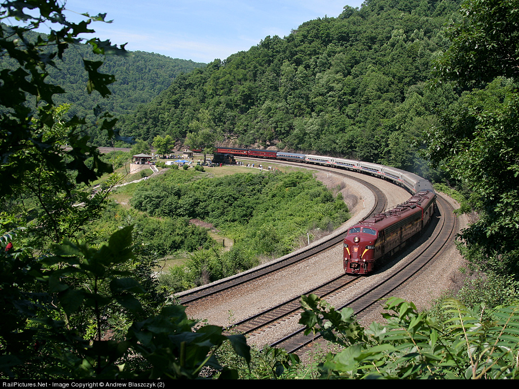The PRR E8's lead the first official trip of the day around Horseshoe Curve seen here heading back to Altoona.