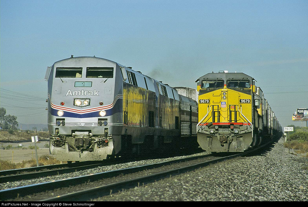 WS-42 runs Amtrak's Sunset Limited around a UP pig train at Kino in north Tucson with P42 No. 1 leading the passenger train.