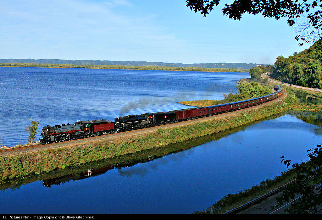 | CP 2816 and Milwaukee Road 4-8-4 No. 261 are heading west from La Crosse, Wis., to Minneapolis along the CPR's ex-Milwaukee Road main line along the Mississippi River at Maple Springs.