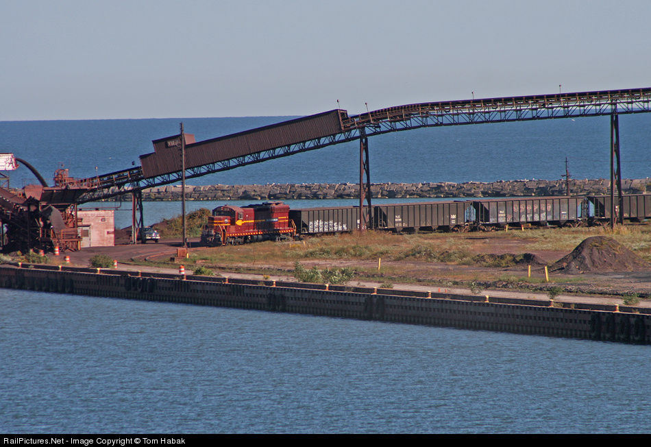 A former DMIR SD18 pulls a cut of hoppers around to position the last one under the tipple.