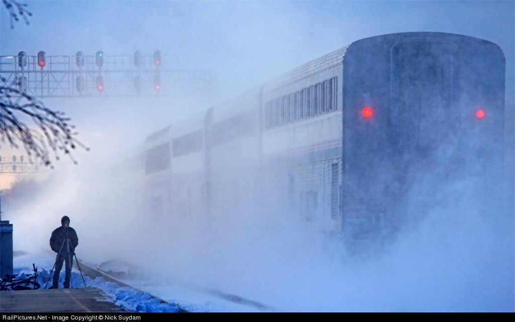 The westbound Southwest Chief leaves Chicago behind in a swirl of snow as it dusts the Metra platform at LaVergne and photographer Chris Lastovich at 70mph.