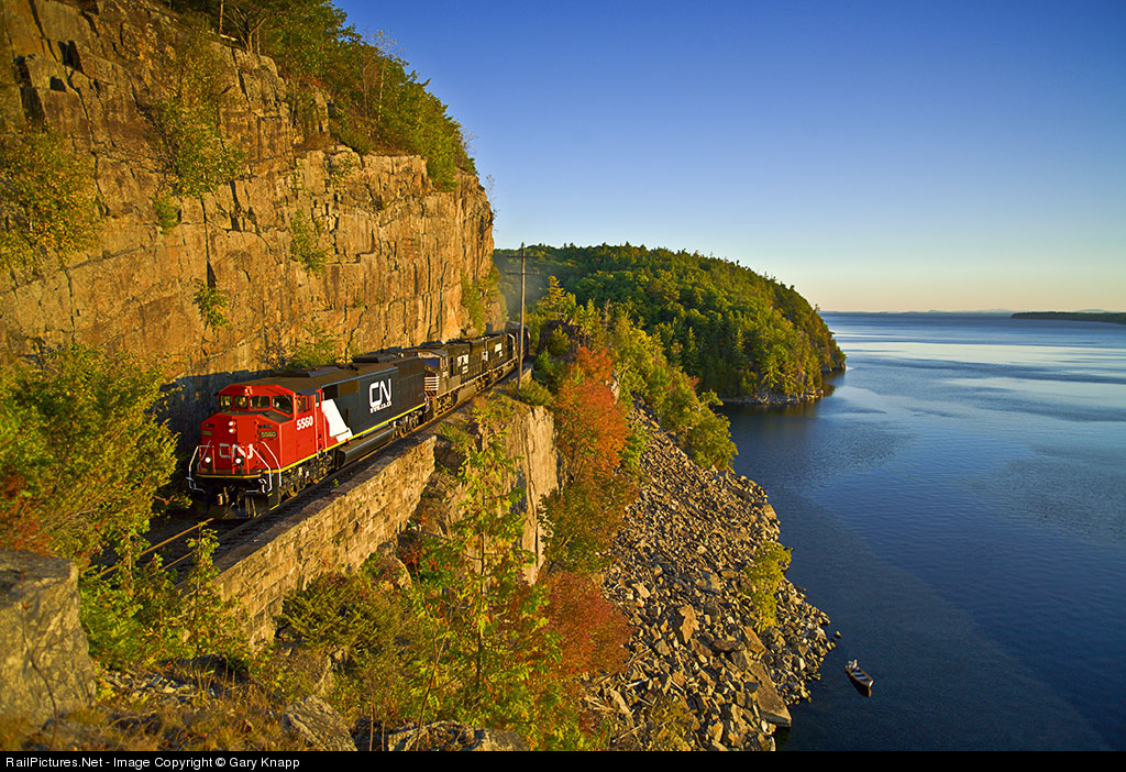 Seven min. after sunrise over Vermonts' Green Mountains, CP 930 parades through this scene above Lake Champlain, (thankfully) behind freshly painted CN 5560 at 07:07.