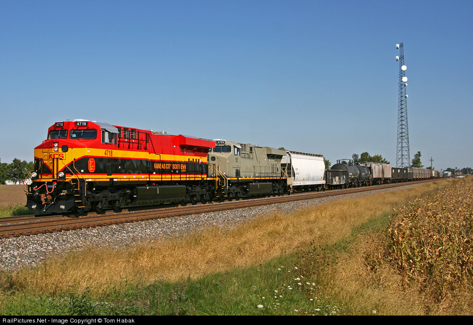 KCS de Mexico engines lead an NS manifest south, past the Diamond with CSX at Attica Ohio. The word on the street is that NS 309 is picking the new deliveries up from GE, in Erie, and bringing them to Bellevue, where they are put in service. Then, through a deal struck with KCS they are used for revenue service routed toward the NS/KCS interchange out west. Noone I've spoken with knows for sure why some of them are painted, and some are coming out in primer, although some have speculated that the ghosts will recieve the standard gray and yellow KCS livery. It was a stroke of luck that the 4718 had the point, and primer sister 4709, was trailing.