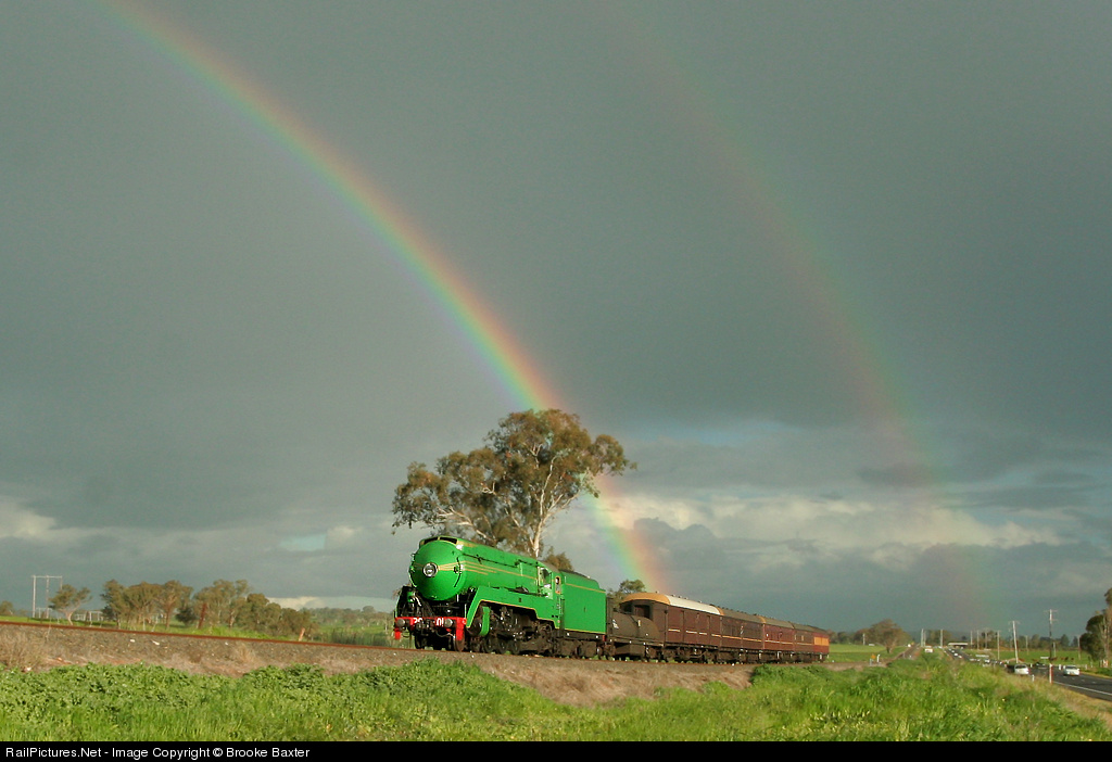 3801 coming out from under 2 huge rainbows at Wellington. "The Heartland Flyer".