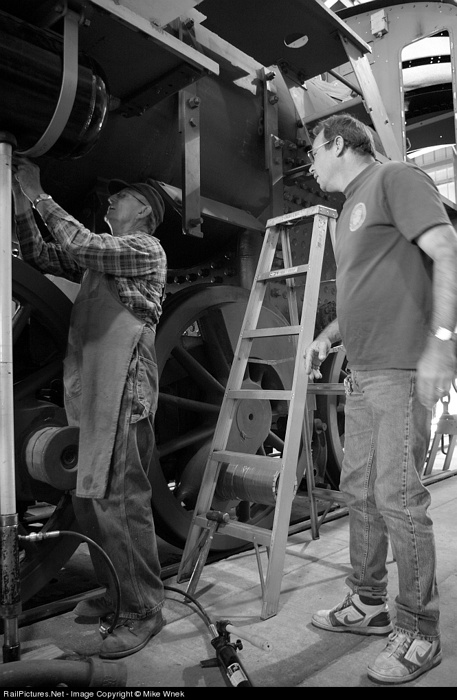 | Volunteers Dave Marshall (left) and Doug Butzow of the Monticello Railway Museum's Steam Shop attach the straps for the air tank on Southern Ry. no. 401. They hope to complete the restoration, which has been underway for several years, by the end of this year or early next year. |