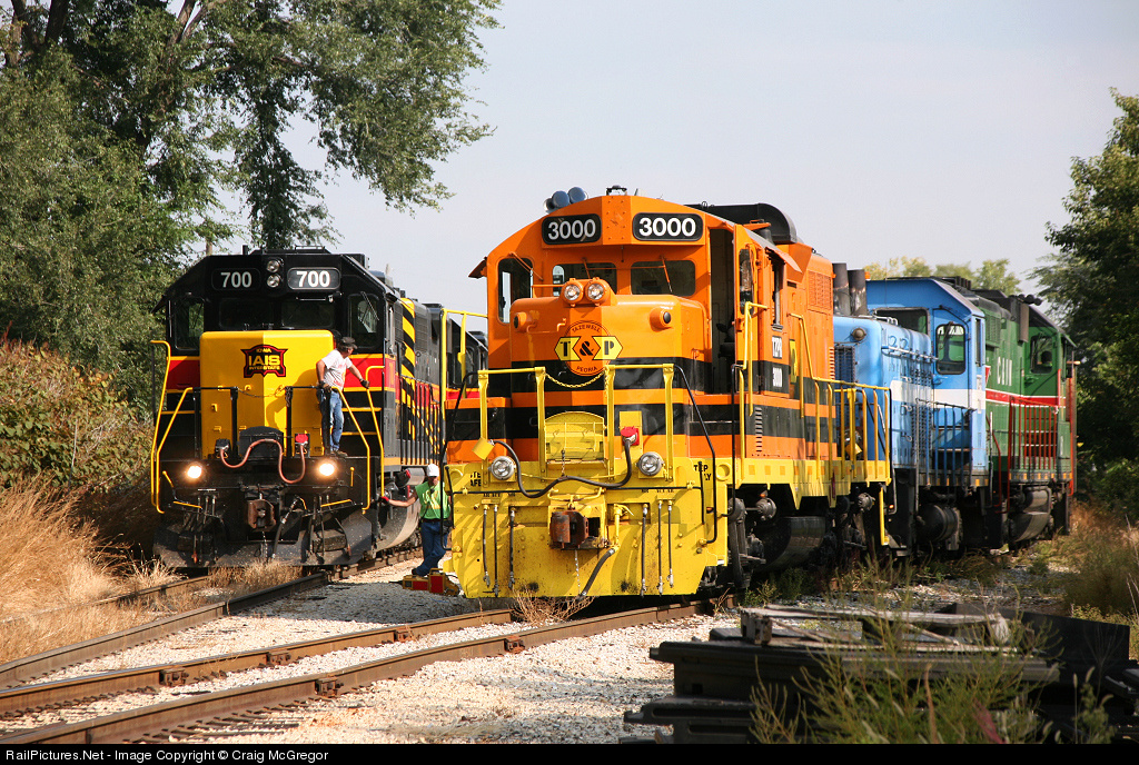 It's interchange time between the Tazewell & Peoria and Iowa Interstate. The TZPR power takes to the side track while the IAIS waits on the main.