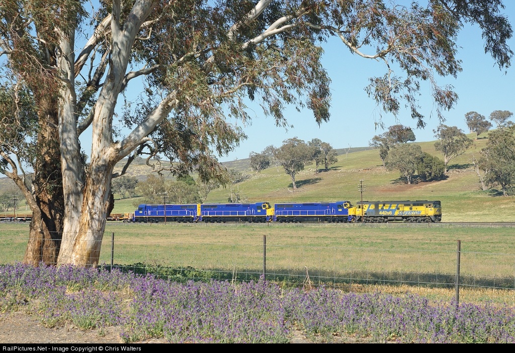 | Silverton 'Jumbo' 442s6 leads newly overhauled and refurbished C508, C503 and C502 through Jindalee (just north of Cootamundra) with a loaded rail set from Melbourne bound for a track upgrade worksite at Galong (between Harden and Yass). |