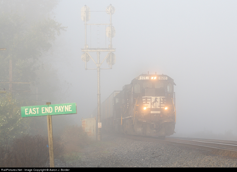 | Eastbound intermodal train 218 bursts out of the dense fog at the east end of Payne siding. The train could be heard for several minutes, but until just seconds before this photo was taken not even the headlight could be seen. |