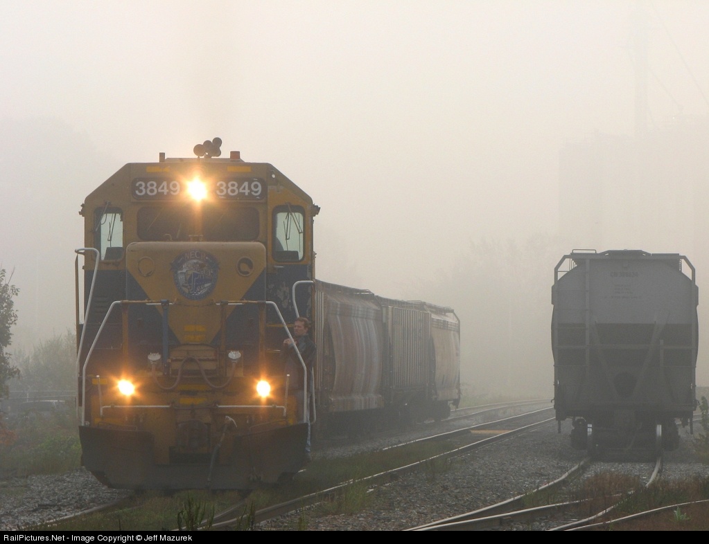 The morning fog has not yet burned off as NECR GP38s 3849 and 3851 begin the switching in Franklin.