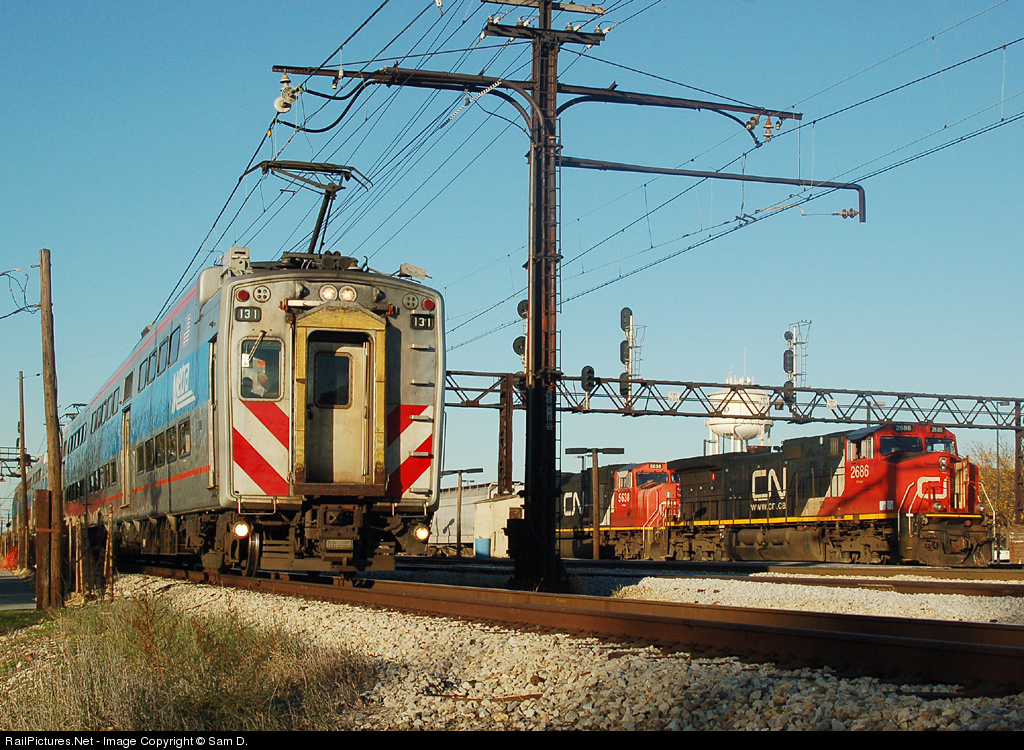 An outbound Metra electric zips past an idling CN train
