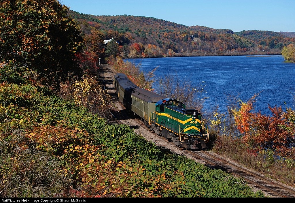 As the foliage season winds down Green Mountain Alco RS-1 #405 brings a trainload of leaf peepers back to Bellows Falls from Chester VT.