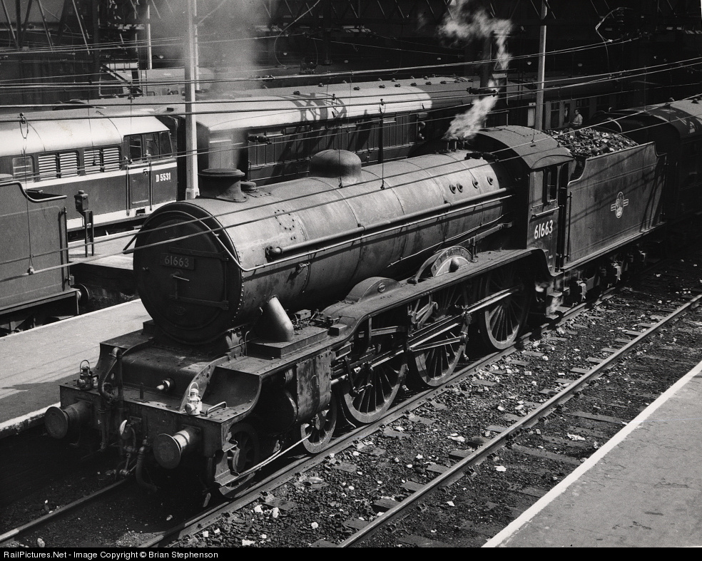 | Gresley class B17 three-cylinder 4-6-0 No 61663 "Everton", one of the class named after football clubs - note the brass football beneath the nameplate - seen from the taxi ramp as it waited to leave with an express. Note the virtually new class 31 diesel in the background - "Everton" would be scrap metal within six months. |