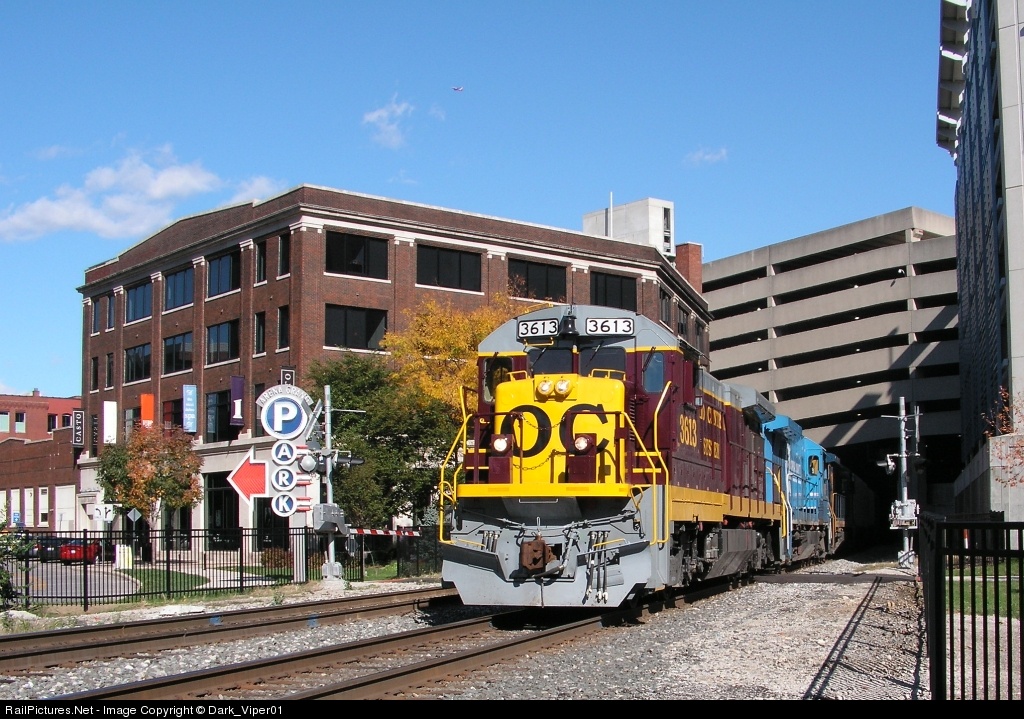 | A freshly painted 3613 brings a buckeye turn lead by 3 dash 7s in 3 different paint schemes out of the tunnel into the arena district and across the now pedestrian only Marconi blvd crossing. |