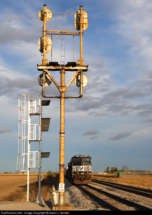 | This bracket mast signal from the Nickel Plate era doesn't have long to live. This evening, though, it still stands watch over a westbound in the siding and a farmer harvesting the last of his field. |