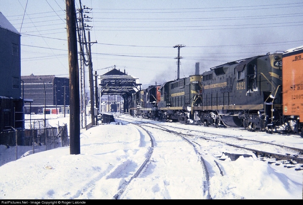 | Westbound Canadian National with lead RS-18 #3681 crossing the Lachine Canal Bridge at St.Henri in Montréal, Québec on February 05, 1966. |