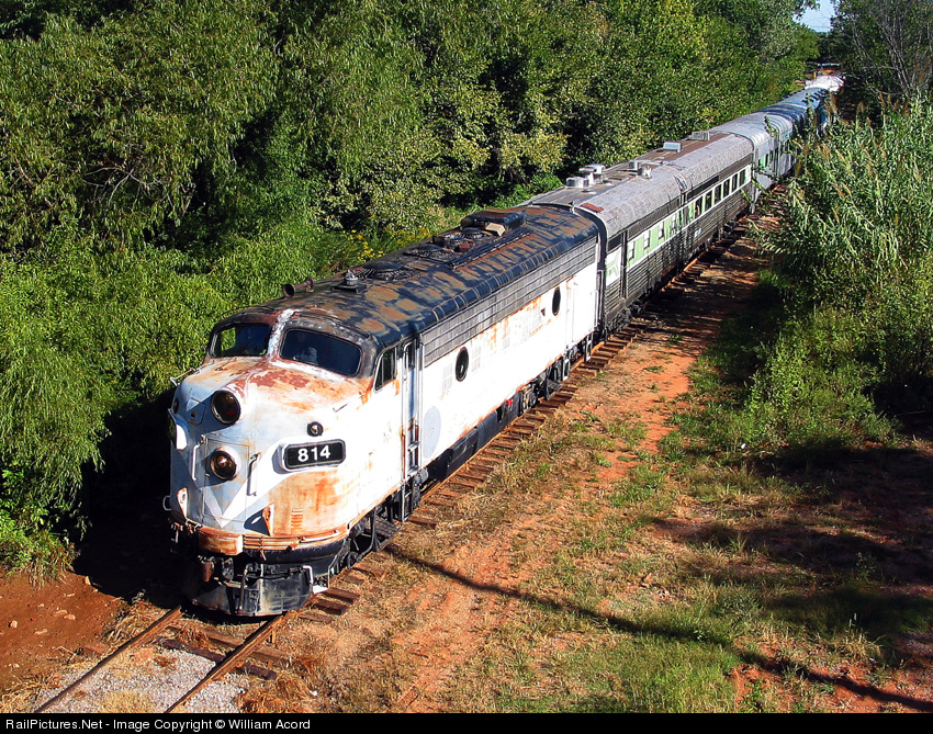 Excursion train operated by the Oklahoma Railway Museum being led along former M K & T trackage by BN #814, which was newly acquired by the museum at the time I took this photo. For a look inside the cab of this locomotive, see photo # 161850.