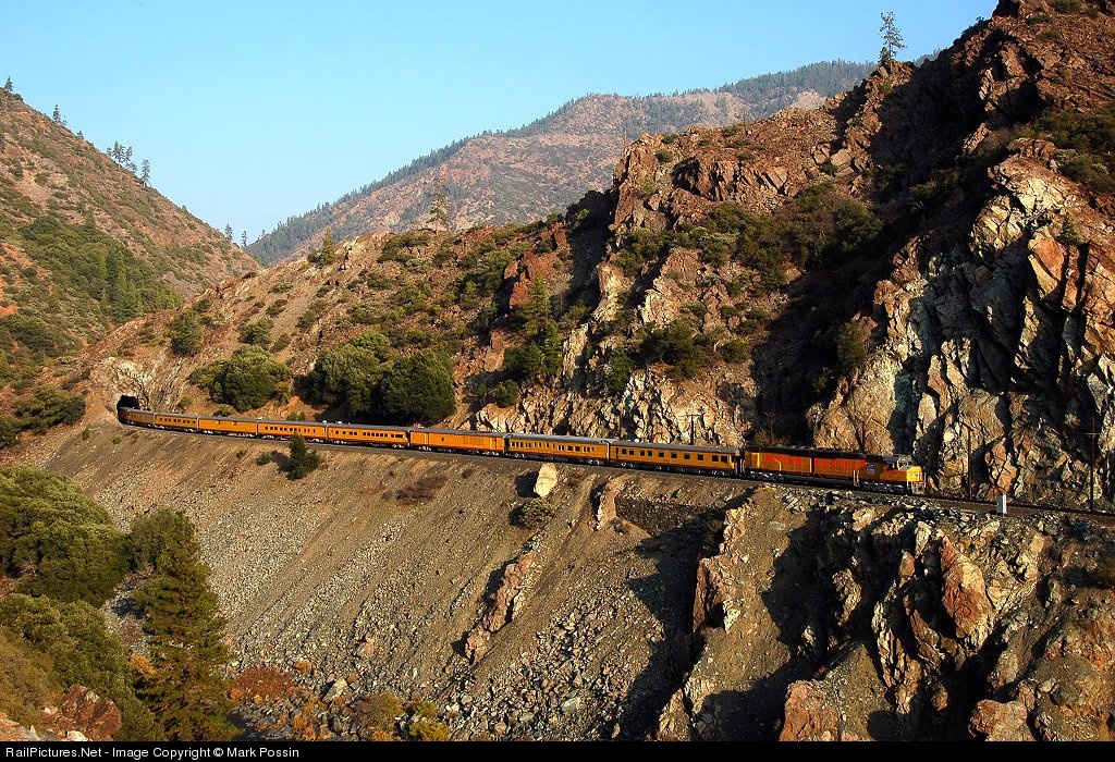 Exiting Tunnel 25, the 6936 and its train approach Rich Bar in the Feather River Canyon.