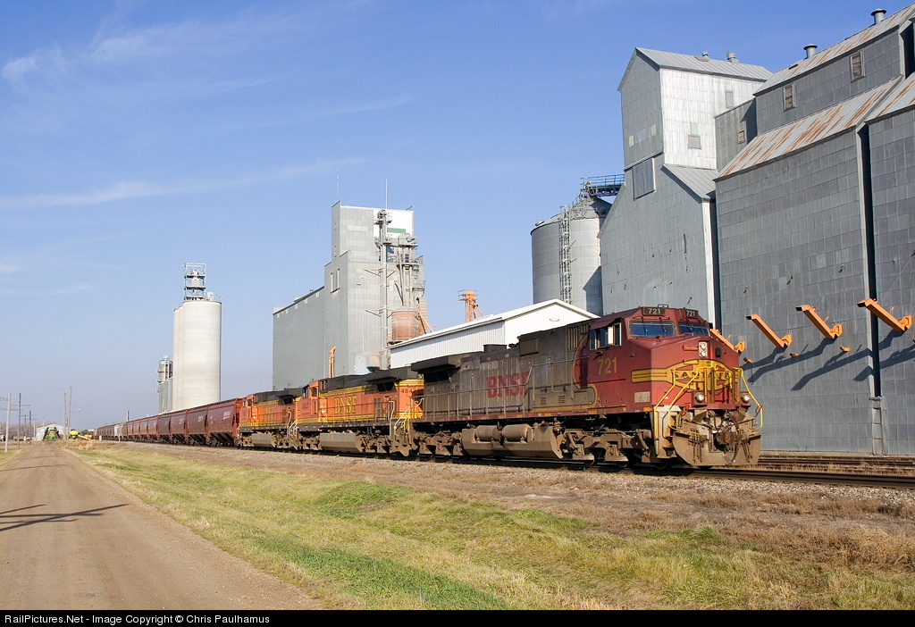 A grain train roars south through Thompson on an unseasonably warm November afternoon in eastern North Dakota (check out the green grass this late in the year!). This train's heading for Alton to drop its cars and then run lite back to Grand Forks. Learn more at Grand Forks Railfanning.