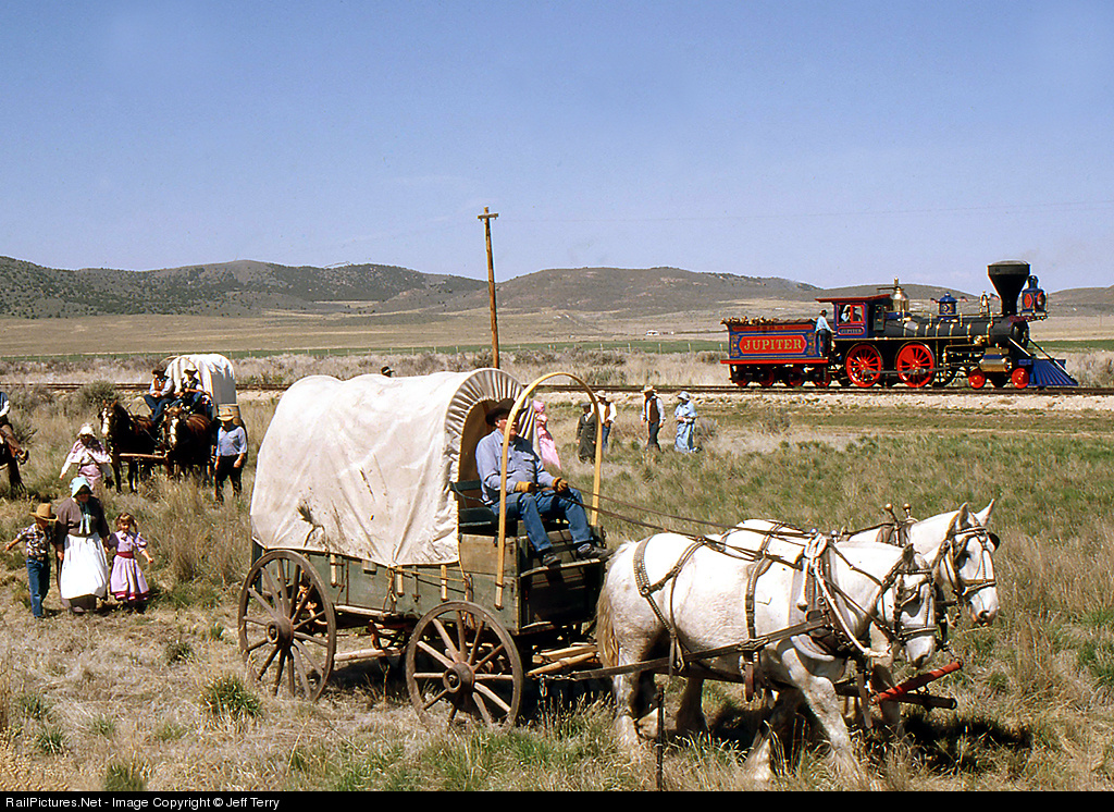 | Wagons Ho! A pioneer wagon train meets Central Pacific No. 60, the "Jupiter," at Promontory. They seem to be going in circles....
