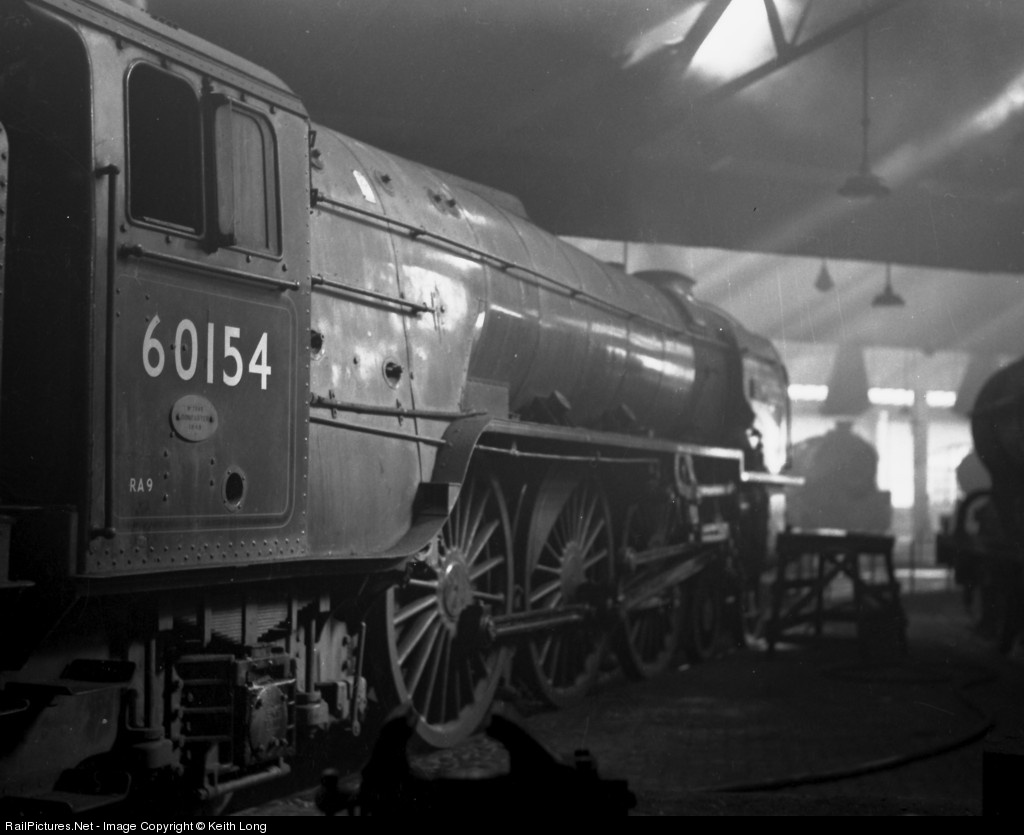| 60154 Bon Accord catches the sunlight in the smoke filled shed at Neville Hill, Leeds, England. |