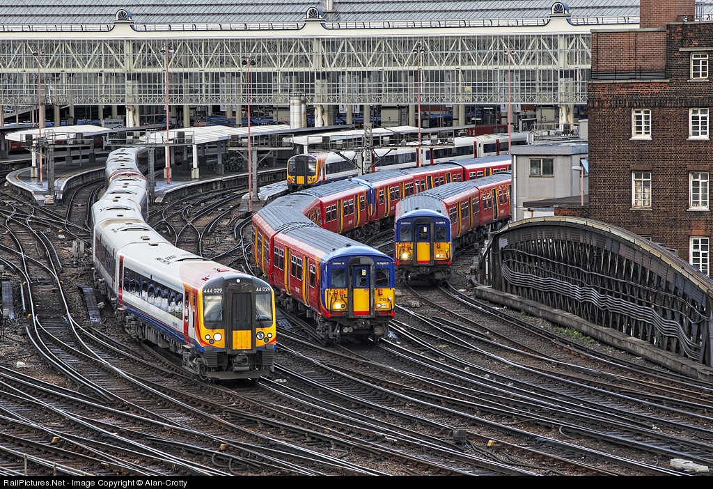 | Evening come early in the UK this time of year, by 15:00 on a miserable November day it's dark enough for headlamps to show up clearly. Waterloo is the largest station in the UK and sees many arrivals and departures per hour. It is not unusual to see three or four train departing at the same time. |