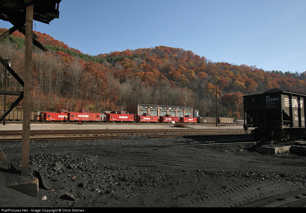 The single-car coal loadout at Andover provides a frame for six NS cabooses sitting in the yard near the shop building. These are used for shove moves by the many mine runs that work the coal branch lines in this area which require long reverse moves.