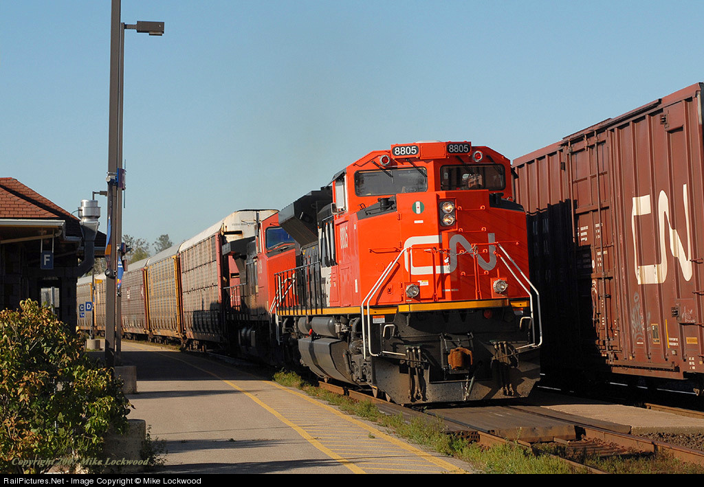 | An impressive display of railroading for the few passengers waiting for VIA Rail at the Cobourg, Ontario, station. CN train 308 behind brand new CN 8805 and vetran 2619 meets a westbound freight at the platform. Pretty good entertainment if you ask me. 1021hrs. |