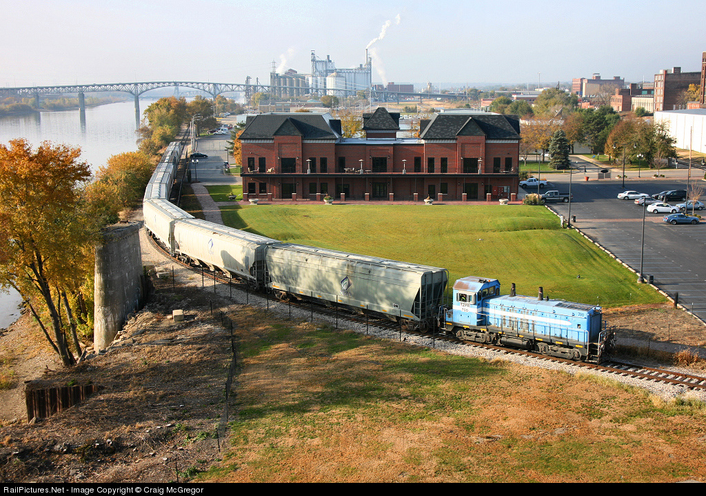 A Tazewell & Peoria switcher serves the ADM ethanol plant (behind bridge in background). The Cedar St. bridge over the Illinois River is the truss bridge in the background while the TZPR lift bridge is in the background behind it. The support in the foreground is a leftover from the Illinois Terminal bridge into Peoria.