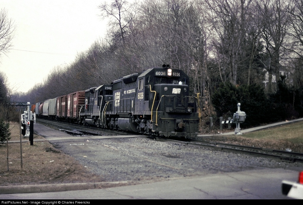 | A Penn Central SD35 and a Penn Central GP35 lead WISE1x through Haworth. Apparently this was an extra (hence the X) from Wilmington DE to Selkirk NY. The SD35 was delivered to Pennsylvania in 1965 and was a class EF25a. GP35 #2342 in the rear also arrived on the Pennsylvania in 1965, but was a class EF25. A former CR rail informed me that the SD35/GP35 set was probably a headache to the crew due to their unreliable multi-step transition systems. |